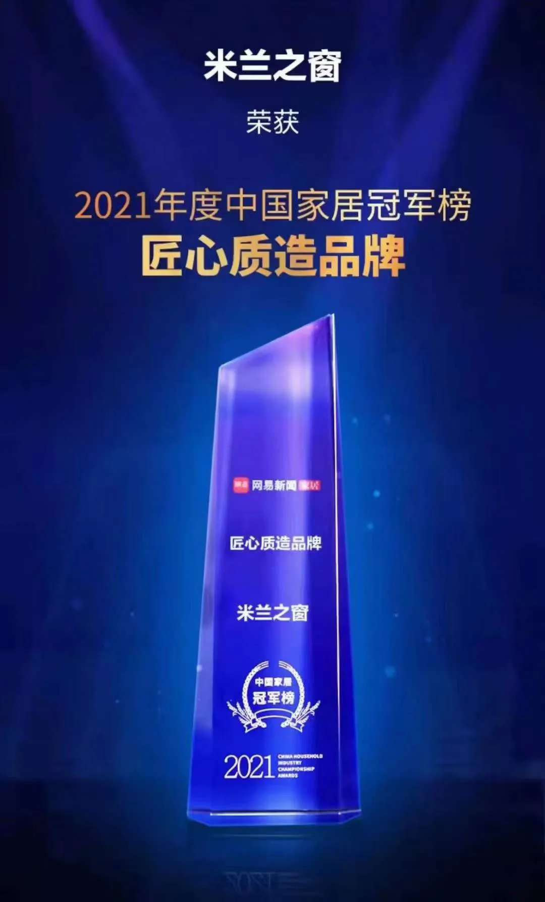 米兰之窗秉承匠心质造精神专注系统门窗领域,从研发中国首个铝包木门窗、幕墙系统,再到时尚跨界、大玩设计,二十三年的行业积淀,始终坚守严苛标准,以匠心铸典范,不断为消费者带来高品质门窗产品,让米兰之窗得以驰骋中国系统门窗领域,助力家居市场健康发展。正是基于这种专业专注的企业精神、精益求精的匠心理念和源源不断的产品创新力,米兰之窗夺得“2021中国家居冠军榜匠心质造品牌”。