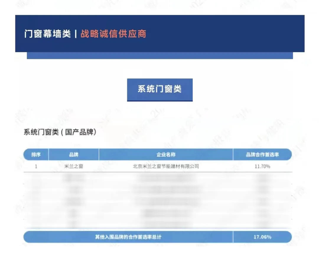会上发布了2021《中国房地产产业链战略诚信供应商研究报告》,米兰之窗再度蝉联系统门窗首选供应商榜首。