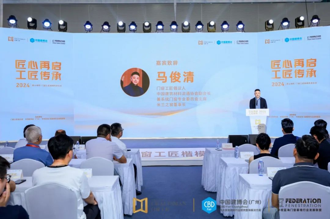 门窗工匠倡议人、中国建筑材料流通协会副会长兼系统门窗专业委员会主席、米兰之窗集团董事长马俊清为本次大会致辞。他说道,回顾我国门窗行业的发展历程,从手工制作到智能化生产,我们经历了无数的风雨和挑战。然而,无论时代如何变迁,工匠精神始终是我们前行的灯塔。正是凭借着吃苦耐劳、精益求精和专注创新的精神,一代又一代的门窗工匠将我们的技术水平提升到了国际领先的高度,在我们奋斗的过程中,我们也深刻认识到教育和传承的重要性。正因为如此,我们对下一代的教育给予了极大的关注和重视。许多门窗工匠的子女通过努力获得了海外留学的机会,他们带着先进的知识和理念回到国内,为企业的发展注入了新的活力,在传承父辈工匠精神的同时,他们也为企业注入了创新和变革的力量。