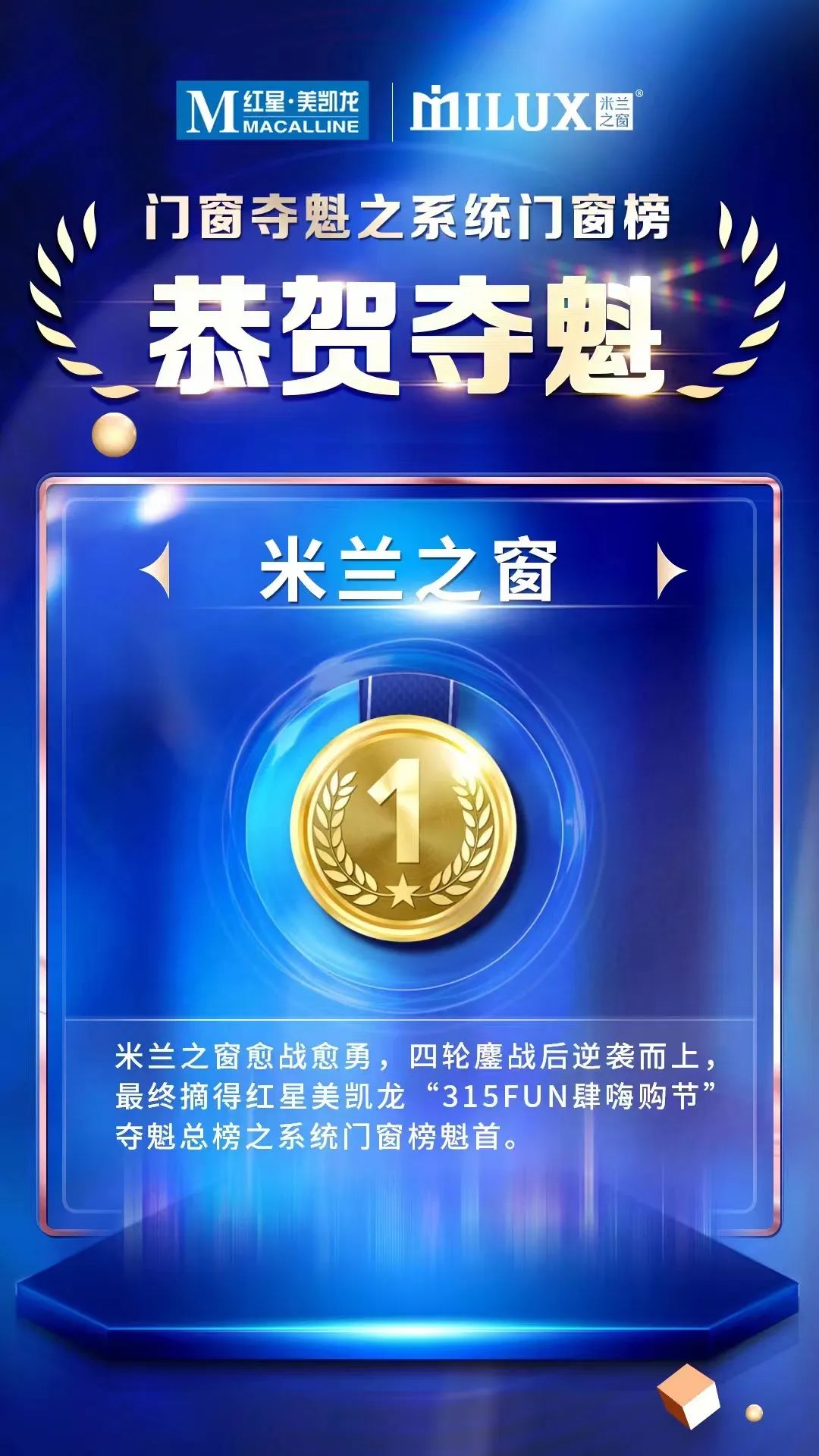 家居行业“现象级”顶流大促——红星美凯龙“315FUN肆嗨购节”正式收官告捷,米兰之窗登顶系统门窗榜品类夺魁榜榜首!本次活动红星美凯龙集团10亿级资源投入,海陆空集结、全行业ALL IN,此次千大品牌共振的家居行业现象级消费盛宴,米兰之窗强强联合红星美凯龙,并肩协作,在战斗中凝结友谊,奏响门窗最强音,燃势打响2022营销首战!
