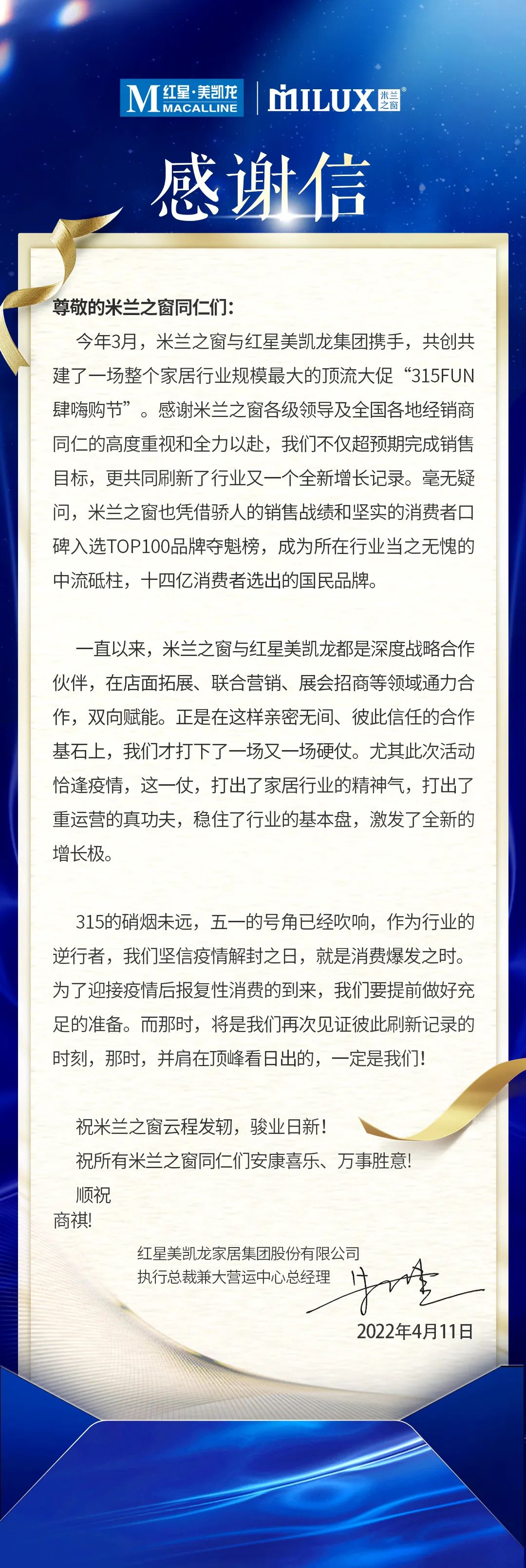 一封长达1000余字的感谢信,字里行间不仅是对战略合作伙伴的肯定,更是共赢美好未来的憧憬!口碑致胜突围市场!本次315活动米兰之窗以同比增长48%的辉煌战绩交出一份完美答卷,在红星美凯龙卖场中涌现25个破百万店面、5个破二百万店面、3个破三百万店面!百万级店面争相崭露。